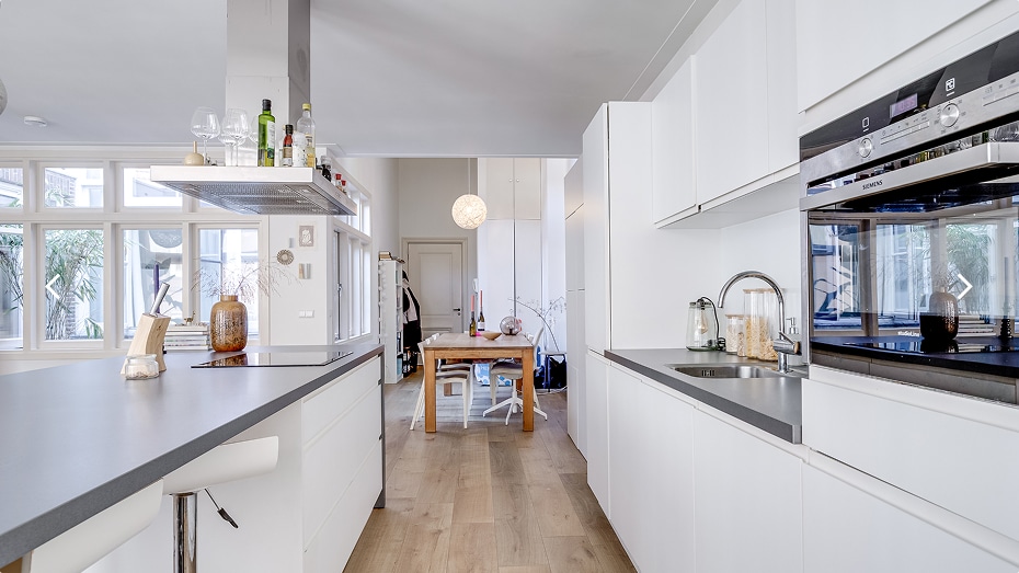 De royale woonkamer wordt gekenmerkt door veel daglicht dankzij grote raampartijen. De open leefkeuken vormt het hart van het appartement: stijlvol, modern en klaar voor lange avonden koken, borrelen en genieten samen of met vrienden en familie.