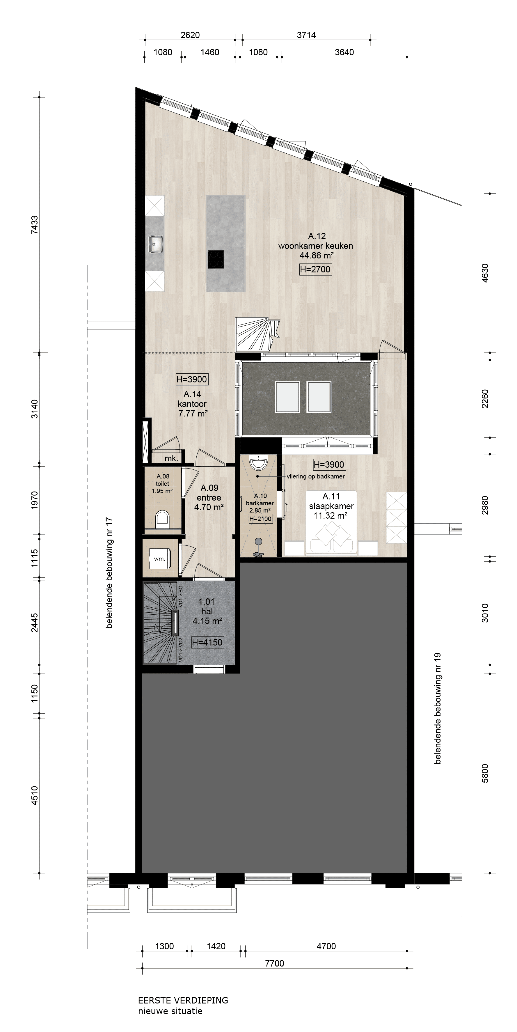 Wanneer u de woning betreedt loopt u door de hal met toilet, door het kantoor naar de woonkamer met open keuken.